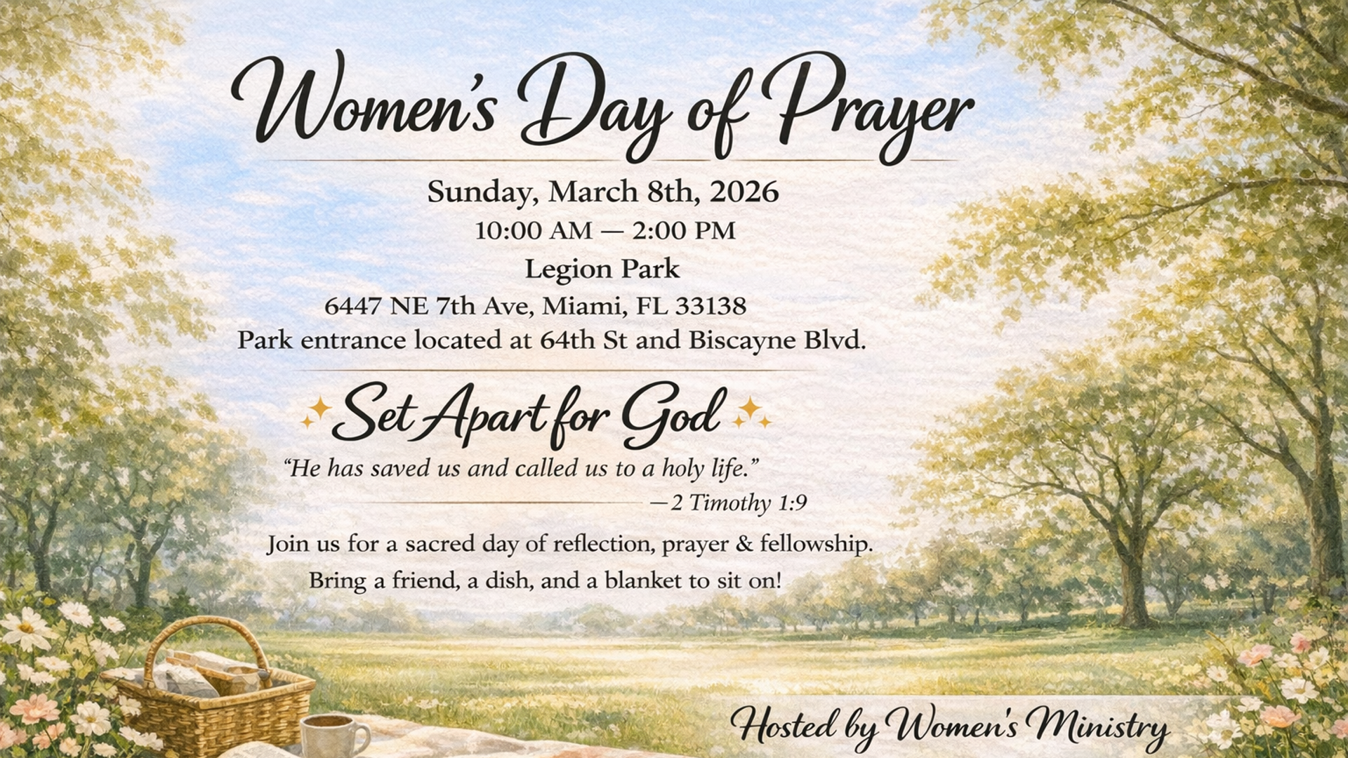 This special gathering invites women to come together for a meaningful time of prayer, fellowship, and encouragement in a peaceful outdoor setting.